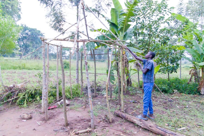 ¨I also made a small semi-permanent hut for myself. I live there now. It’s made of mud walls and a thatched grass roof. It took me three weeks to finish it on my own. And that is not all. I started building a small kitchen for my mother. It is made of nails and big wood. I wanted to make it easy for her to cook. She no longer has to worry about cooking outside on the stones. I plan to finish the small kitchen soon. I am sure she will be happy to see it.¨
